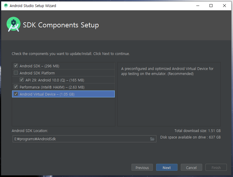 테마는 원하는 테마를 선택해준 뒤 SDK Components Setup에서 모두 체크해주시고 SDK 경로는 원하시는 경로로 선택해주세요.