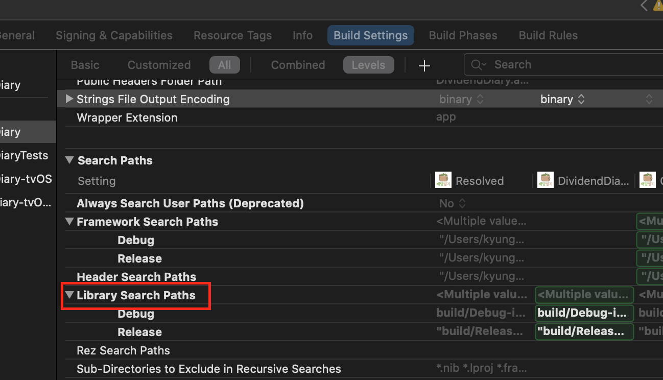 Build Settings > Library Search Paths를 찾습니다.