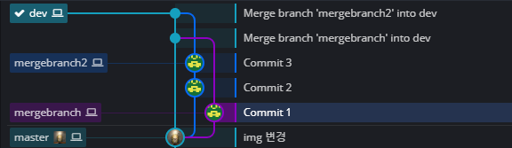 그럼 이상태에서 branch2를 dev에 merge 해보겠습니다.