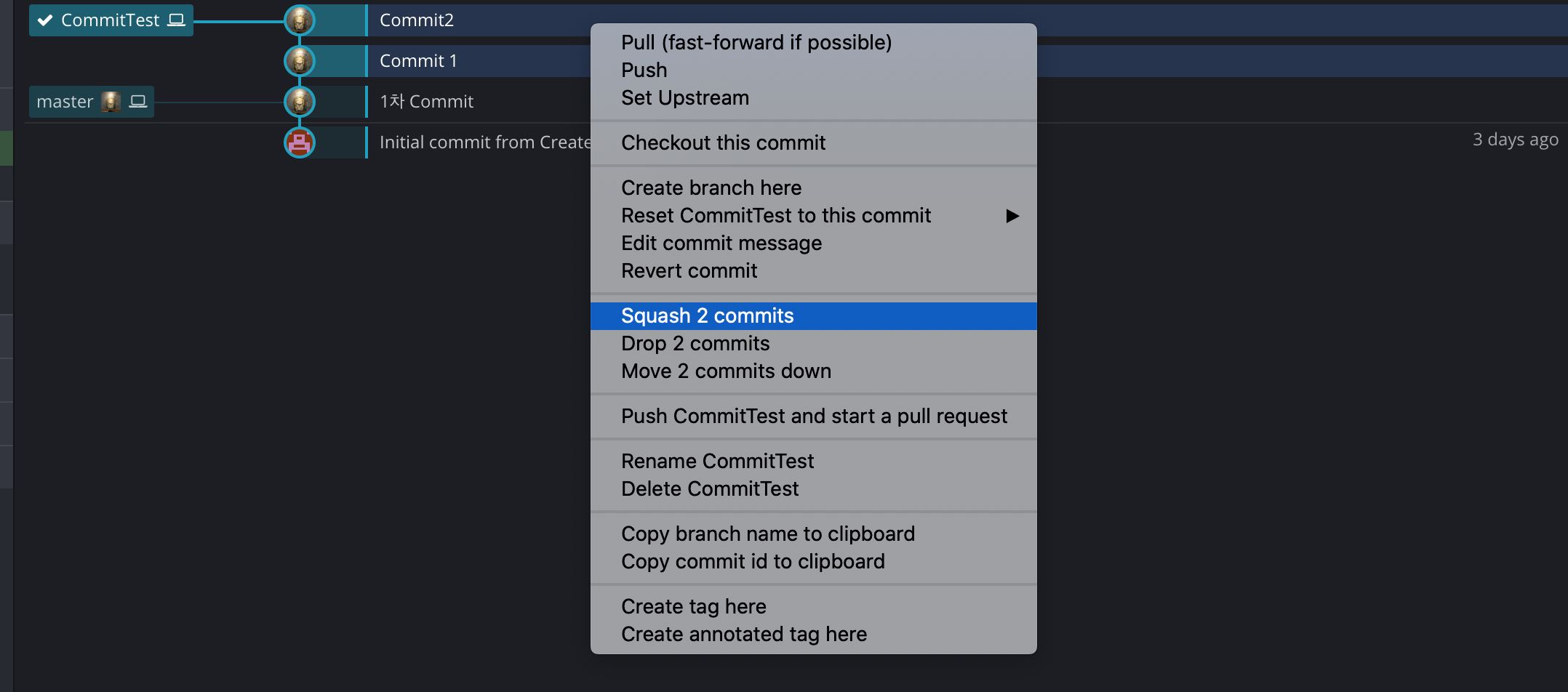 두 개의 Commit History를 선택한 후 오른쪽 버튼을 눌러 Squash 2 commits를 선택합니다.