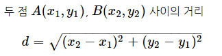 위 함수는 유클리드 거리 공식을 사용하여 두 점사이에 거리를 구하는 공식입니다.