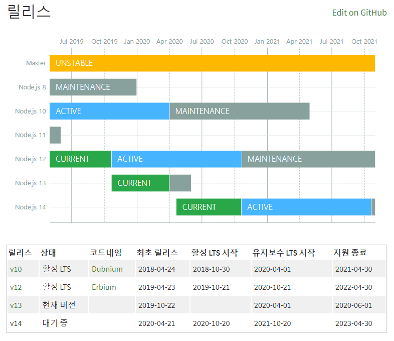 node는 버전마다 지원되는 날짜가 다르기에 최신 지원 버전을 사용하는 것이 좋습니다.