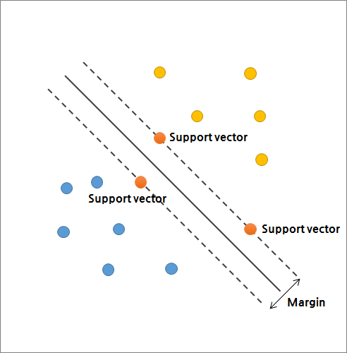 두 개로 나뉜 데이터가 존재할 때 초평면(Heperplane)이 두 집단을 나누게 되는데 각 집단의 경계에서 초평면과 거리를 최대로 만들게 되는 값이 가장 잘 표현한 선이고 최대 거리를 만드는 데이터들을 Support Vector라 합니다. 서포트 백터 머신 알고리즘은 모든 집단에 대해 이러한 서포트 백터들을 찾아 최적화된 형태로 분류 합니다. 서포트 백터 회귀분석은 이러한 서포트 백터 머신의 변형된 형태로서 데이터의 회귀 분석에 사용된다.