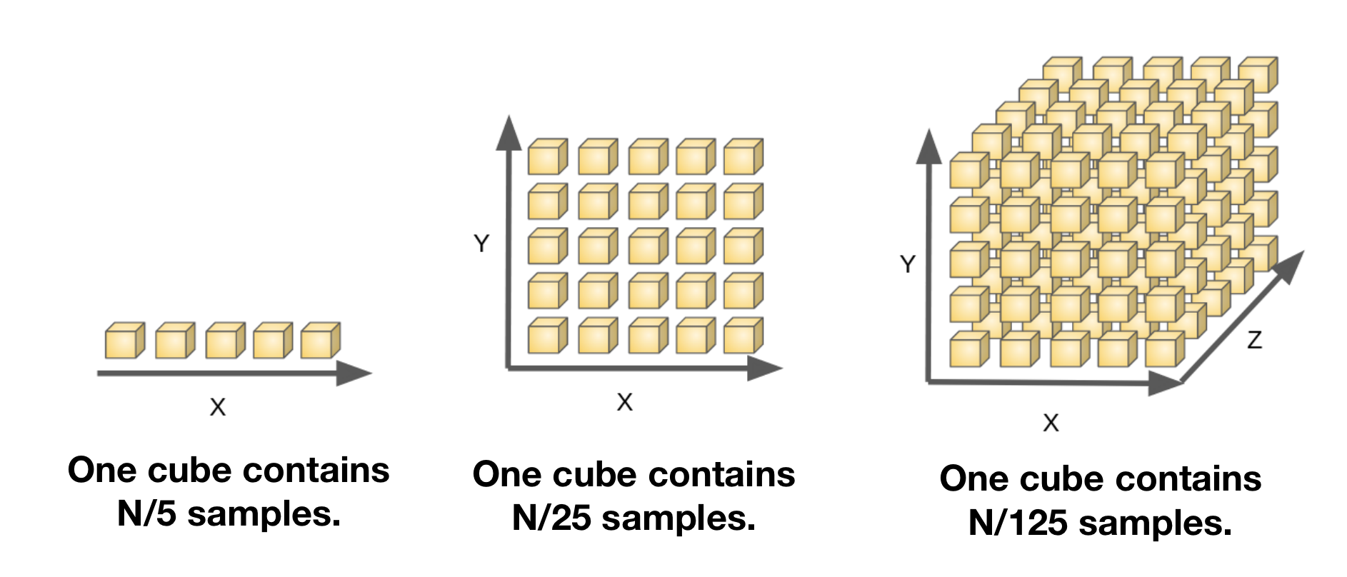 - 3차원에서 데이터의 밀집도는 N/125로 하나의 큐브는 N/125 샘플을 가지게 됩니다.