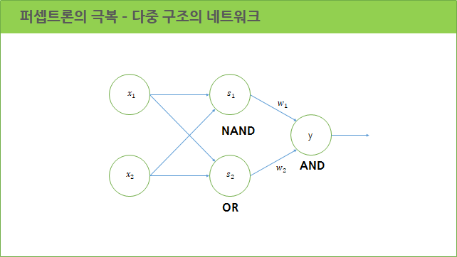 이런 한계를 극복하기 위해 퍼셉트론으로 다중 구조의 네트워크를 만들 수 있습니다. 앞에서 알아본 NAND, OR, AND로 네트워크를 만들면 XOR를 만들어 낼 수 있습니다. 선형적인 구조가 아닌 비선형 구조의 문제도 해결 할 수 있다는 것이죠.