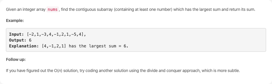 문제에서 예를 들면 4, -1, 2, 1 의 연속된 구간의 합이 max가 되기 때문에 6이 답이 됩니다.